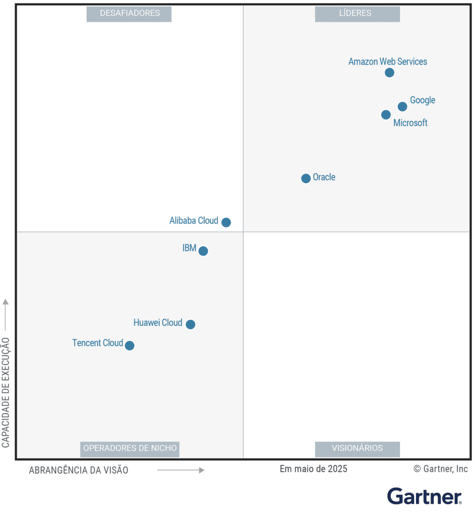No Quadrante Mágico da Gartner de 2025 para serviços estratégicos de plataforma de nuvem, a Amazon Web Services (AWS) ocupa a posição mais alta em capacidade de execução e é reconhecida como líder em termos de abrangência de visão e capacidade de execução.