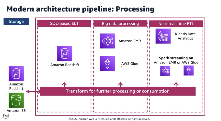 - Processamento: Transformações, limpeza, enriquecimento e agregação são aplicadas. Armazenamento temporário (ex: armazenamento local em um cluster Amazon EMR ou áreas de staging temporárias no S3) pode ser usado durante esta fase.