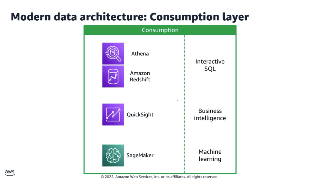- Tecnologias: Amazon SageMaker (um serviço de ML totalmente gerenciado) se conecta diretamente aos dados curados na camada de armazenamento (S3 e Redshift) por meio de interfaces simplificadas, abstraindo a complexa “canalização” de dados (data plumbing) e permitindo que os cientistas de dados se concentrem puramente na inovação do modelo.