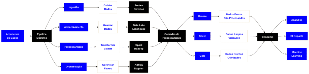 A arquitetura de dados moderna, é dividida logicamente em camadas distintas focadas em preparar, transformar e tornar os dados acessíveis. Essa estrutura garante a confiabilidade, escalabilidade e democratização dos dados em toda a organização.