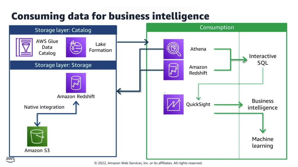 - Tecnologias: Amazon QuickSight (um serviço de BI serverless). O QuickSight pode ser alimentado por conexões de alto desempenho tanto com o Amazon Athena quanto com o Amazon Redshift. Um valor agregado significativo é a integração do QuickSight de insights de ML gerados automaticamente, como previsão precisa, detecção de anomalias e recursos de consulta em linguagem natural.